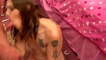 Shemale biker domineert en neukt getatoeëerde hunk keihard!
