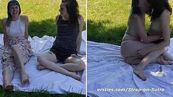 Busty lesbian babes scissor and lick outdoors