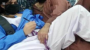 Pelakon pakai bindi dan gelang, naik di kawasan halaman. Rintih bergema masa gosok dengan kain sutera, badan bergesel rapat.