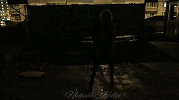 pretty blonde's risky naked autumn walk flashing big tits outdoors