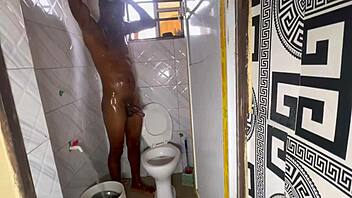 big black cock throbs under shower water getting soapy