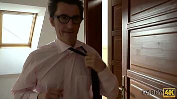 old guy explores petite teen's shaved pussy in bedroom 👅 old4k cunilingus